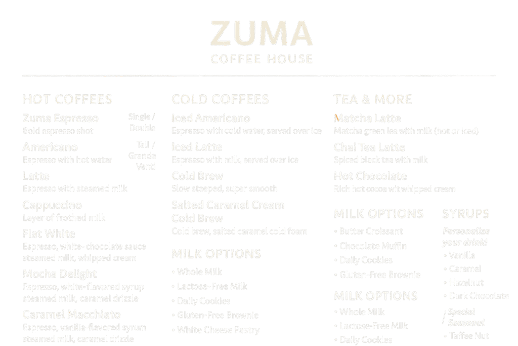 Zuma Coffee House’a adım attığınızda yalnızca kahve içmezsiniz; tutkuyla hazırlanmış bir deneyimi yaşarsınız.